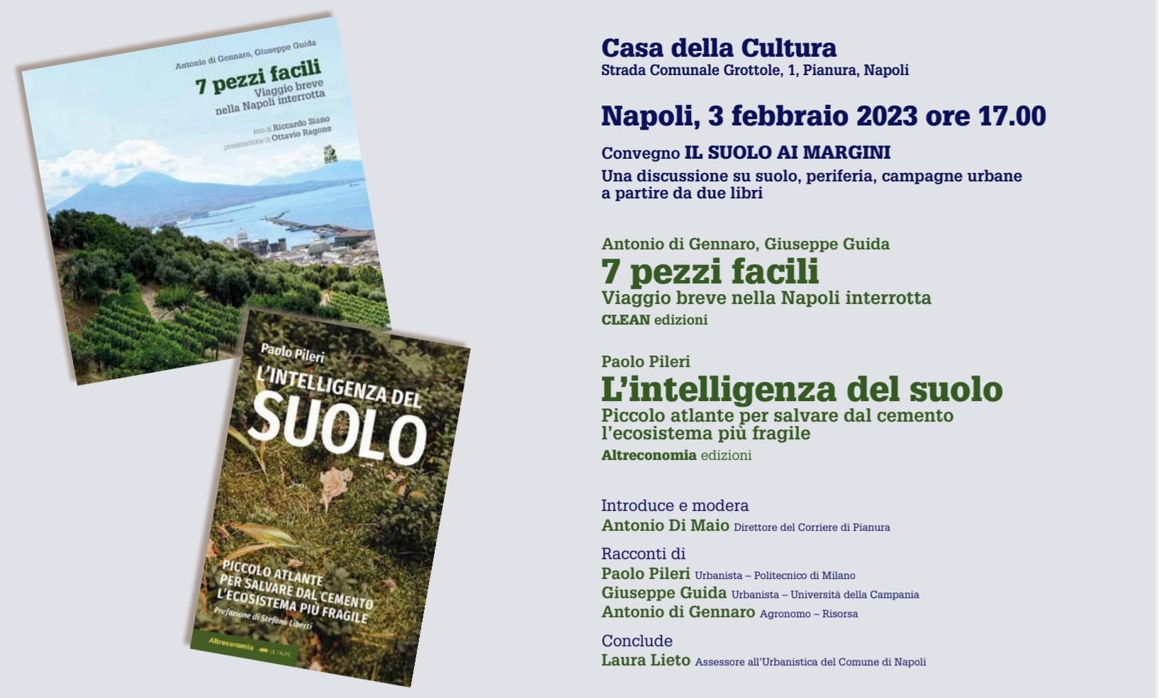 Ed è per questo che ne discuteremo venerdì 3 febbraio, ore 17.00, alla Casa della Cultura di Pianura (strada comunale Grottole 1) a Napoli a partire dal mio libro “L’intelligenza del Suolo” (Altreconomia, 2022) e da quello di Antonio di Gennaro e Giuseppe Guida, “7 Pezzi facili” (Clean, 2022) che affronta questi temi con riferimento alle periferie e alle campagne urbane della città di Napoli. Parteciperanno all’incontro il presidente della IX Municipalità Pianura-Soccavo Andrea Saggiomo, e Laura Lieto, assessore all’urbanistica del Comune di Napoli, che tirerà le conclusioni. Su questi stessi temi altri due incontri dedicati a “L’intelligenza del suolo” sono programmati nella giornata di sabato 4 febbraio: la mattina a Caserta al Polo Scientifico dell’Università della Campania (Viale Lincoln 5); alle 18.00 alla Casa del Volontariato a Salerno (Corso V. Emanuele 90).