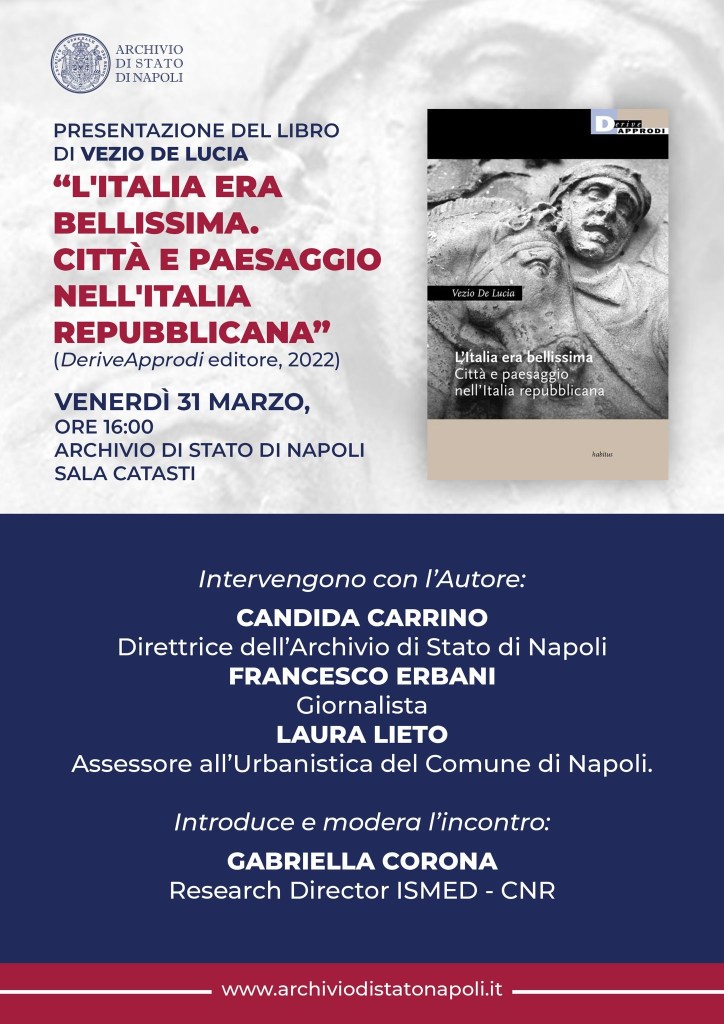 Poi il 31, all’Archivio di Stato, la presentazione dell’ultimo libro di Vezio De Lucia, “L’Italia era bellissima. Città e paesaggio nell’Italia repubblicana” DeriveApprodi editore.