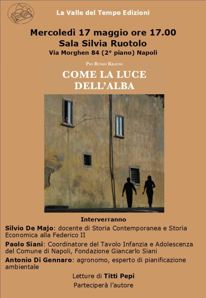Si presenta domani, presso la sala “Silvia Ruotolo” in Via Morghen 84, alle ore 17.00, il romanzo di Pio Russo Krauss “Come la luce dell’alba”, La Valle del Tempo Edizioni. Intervengono con l’autore, oltre al sottoscritto, Silvio De Majo, docente di Storia contemporanea e Storia economica presso l’Università Federico II di Napoli, e Paolo Siani, coordinatore del tavolo “Infanzia e Adolescenza” del Comune di Napoli e consigliere della fondazione “Giancarlo Siani”. Titti Pepi leggerà brani del romanzo.