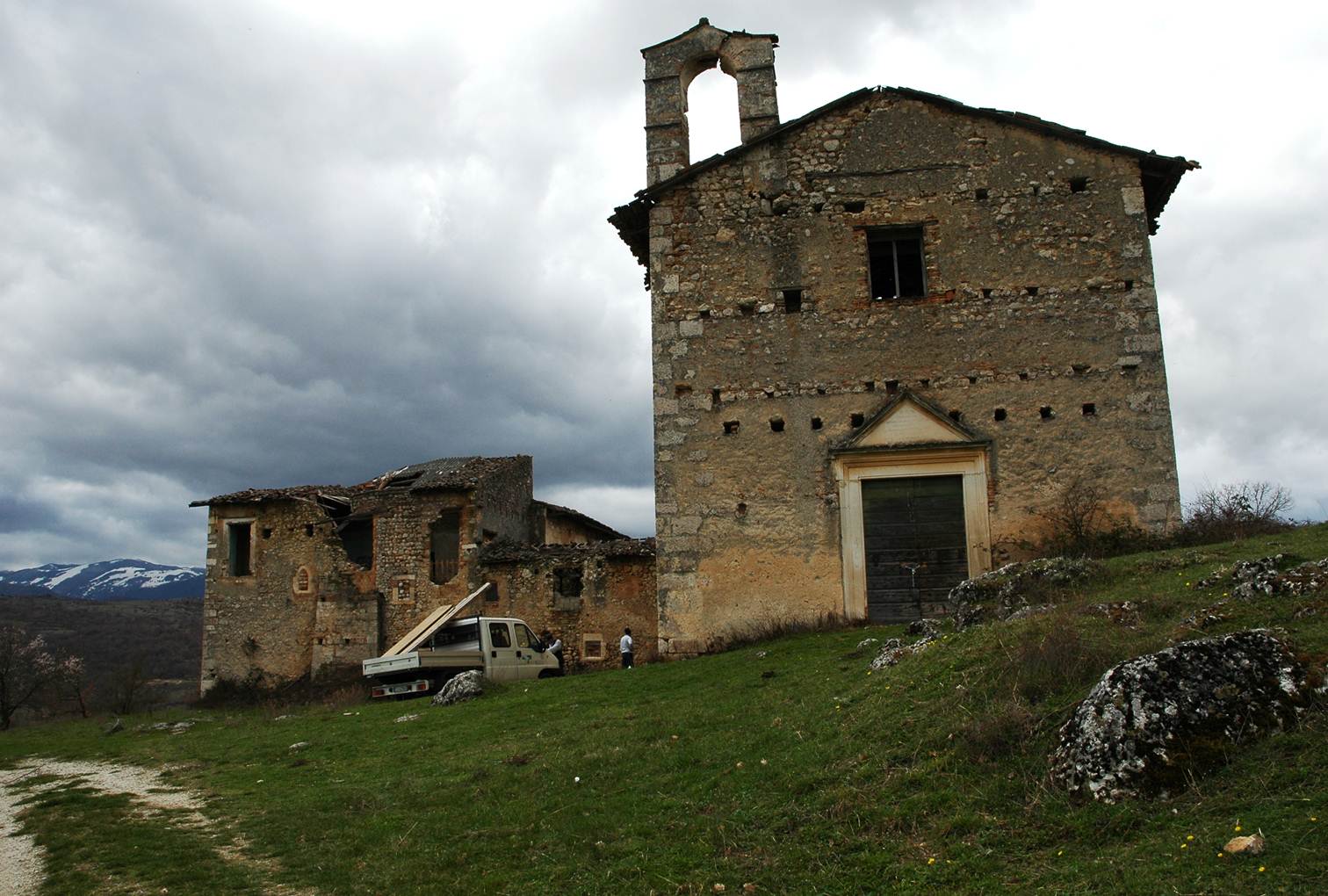 Diresti che è inverno, e invece sono fioriti i mandorli sul colle della Madonna delle Grazie, tutt’intorno la chiesa medievale ferita, a Coppito, dove i fiumi de l’Aquila si incontrano, il Raio e l’Aterno.