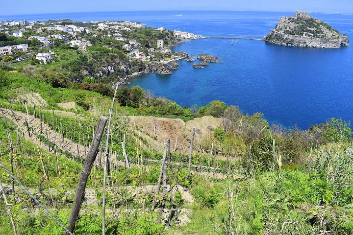 Secondo i giudici del Vinitaly 2019 il bianco più buono d’Italia si produce proprio qui, sui vigneti di scogliera di Punta del Lume, in faccia al mare, con davanti il più straordinario allineamento di vulcani, la cupola magmatica del Castello Aragonese, poi Vivara, Capo Miseno, Trentaremi, e a chiudere lo skyline azzurro del Somma-Vesuvio.