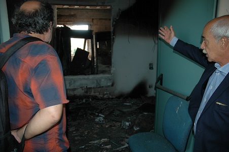 L’impianto come si è detto non era attualmente in funzione, per riattivarlo sarebbe bastato un revamping del costo di poche centinaia di migliaia di euro. In questi ultimi anni, grazie a De Biase, la Gesen aveva comunque continuato a produrre un diverso tipo di energia, che ha a che fare con la cultura, la conoscenza, la coscienza civica. L’auditorium al terzo piano della palazzina degli uffici era diventato, proprio nel mezzo dell’area più critica della Campania, un centro di divulgazione per migliaia di studenti delle scuole pubbliche dell’intera regione, che qui venivano a studiare come si ricostruisce un ecosistema, come si ripara la terra ferita. Quando entriamo sembra dopo un bombardamento. Le mura annerite dal fuoco, gli arredi a terra, maciullati, il soffitto che viene giù a pezzi. Persino le soglie di marmo delle scale sono state spezzate, una ad una, con rabbia