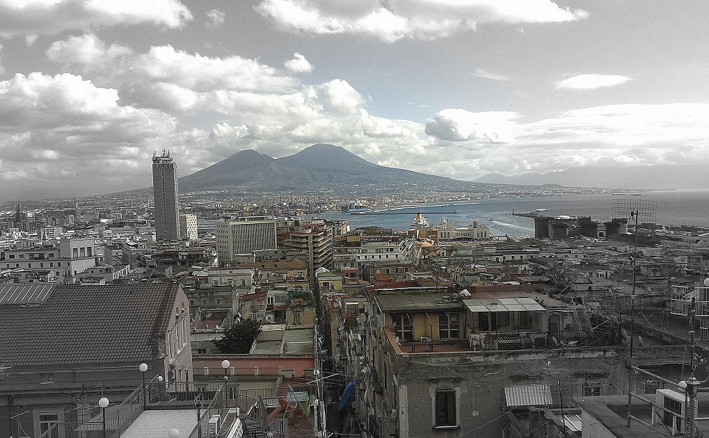 Lungo il sentiero in terra perfettamente curato che ci porta in alto, le cime degli alberi tremano nel vento; sotto di noi il reticolo immenso della città storica, fino al porto, il Maschio Angioino, il colonnato della piazza grande, poi si spalanca il golfo, con il Vesuvio e la Penisola sospesi nell’azzurro.