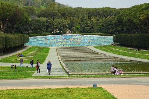 Adesso passeggiamo nel Viale maestoso delle Palme, con gli alberi giunti direttamente dalla Libia; a fianco il Cubo d’Oro sembra un oggetto fiabesco, extraterrestre. Un ficus monumentale emerge da un intrico di radici, in una scena da giungla tropicale. Alla fine del viale, il profilo inconfondibile degli archi di Edenlandia, disegnati da Luigi Piccinato. Il parco dei divertimenti e il giardino zoologico sono nati con la mostra, ora c’è un muro che li separa, ma Donatella vorrebbe abbatterlo, per ricreare l’unità originaria. Dopo la crisi, lo zoo ha ripreso il suo cammino, anche per Edenlandia sembra sia la volta buona, con un progetto imprenditoriale più credibile. Intanto, sui prati verdi attorno la Fontana dell’Esedra gruppi di ragazzi prendono il sole sull’erba. Lo scenario è di suggestione totale. Alle spalle del grande arco maiolicato della fontana, lo sfondo dei terrazzamenti agricoli di Monte Sant’Angelo. La sensazione è quella di una monumentalità vissuta, ben curata, e spira una certa aria d’Europa.