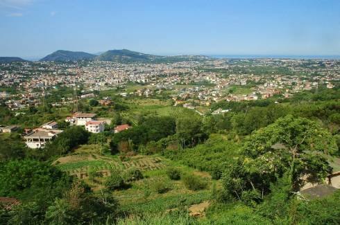 Nel paesaggio avanti a noi la corona di piccoli villaggi persi nell’arboreto medievale non si vede più, ora c’è una città reticolare diffusa di 41.000 abitanti. I primi diecimila arrivarono col bradisismo, gli altri 25.000 dopo il sisma dell’80, in un flusso che in questi quarant’anni non s’è mai interrotto. Le aree edificate si sono moltiplicate per 30, ora sono 600 ettari, sui circa 1400 del territorio comunale. Vuoi chiamarla città, ma è un’altra cosa, un reticolo fitto di palazzine spontanee, ai bordi di strade rurali senza marciapiede, che prima o poi ti riportano alla campagna.