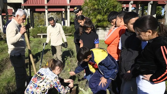 Assieme agli alberi, sono parte del dono un grande tavolo, con le panche, tutto in legno massiccio, ricavato da alberi morti per cause naturali all’interno delle riserve naturali dello Stato gestite dell’Arma dei Carabinieri, i bambini non perdono tempo, hanno fame, se ne appropriano subito, accalcandosi tutt’attorno per uno spuntino.